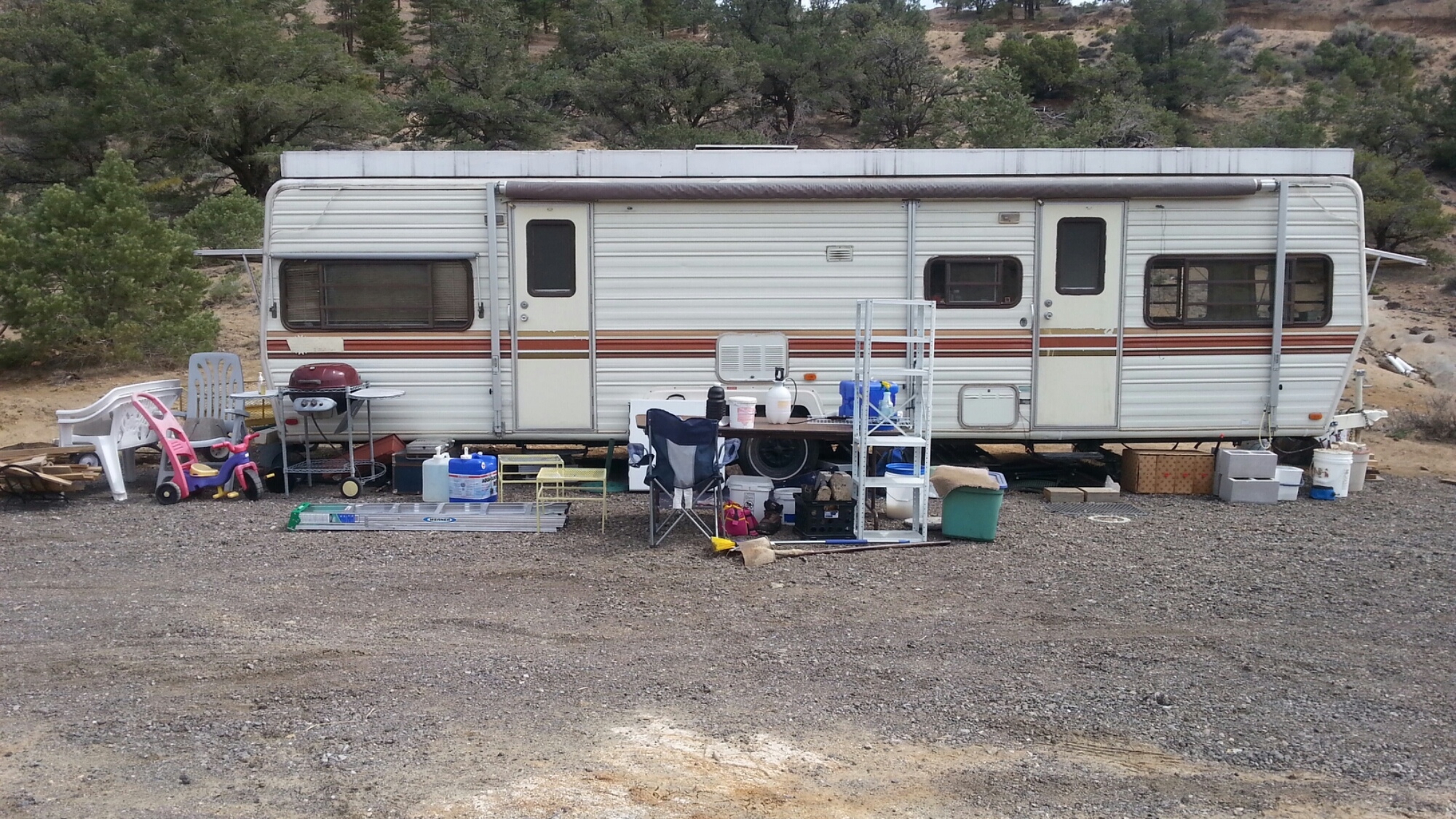 Not a very pretty sight at the moment. We’ve kinda thrown things by the trailer, no organization outside whatsoever. The bad weather last week didn’t help. Or the fact that it took us a couple days to get the inside organized (much more important and yet still not completely done).