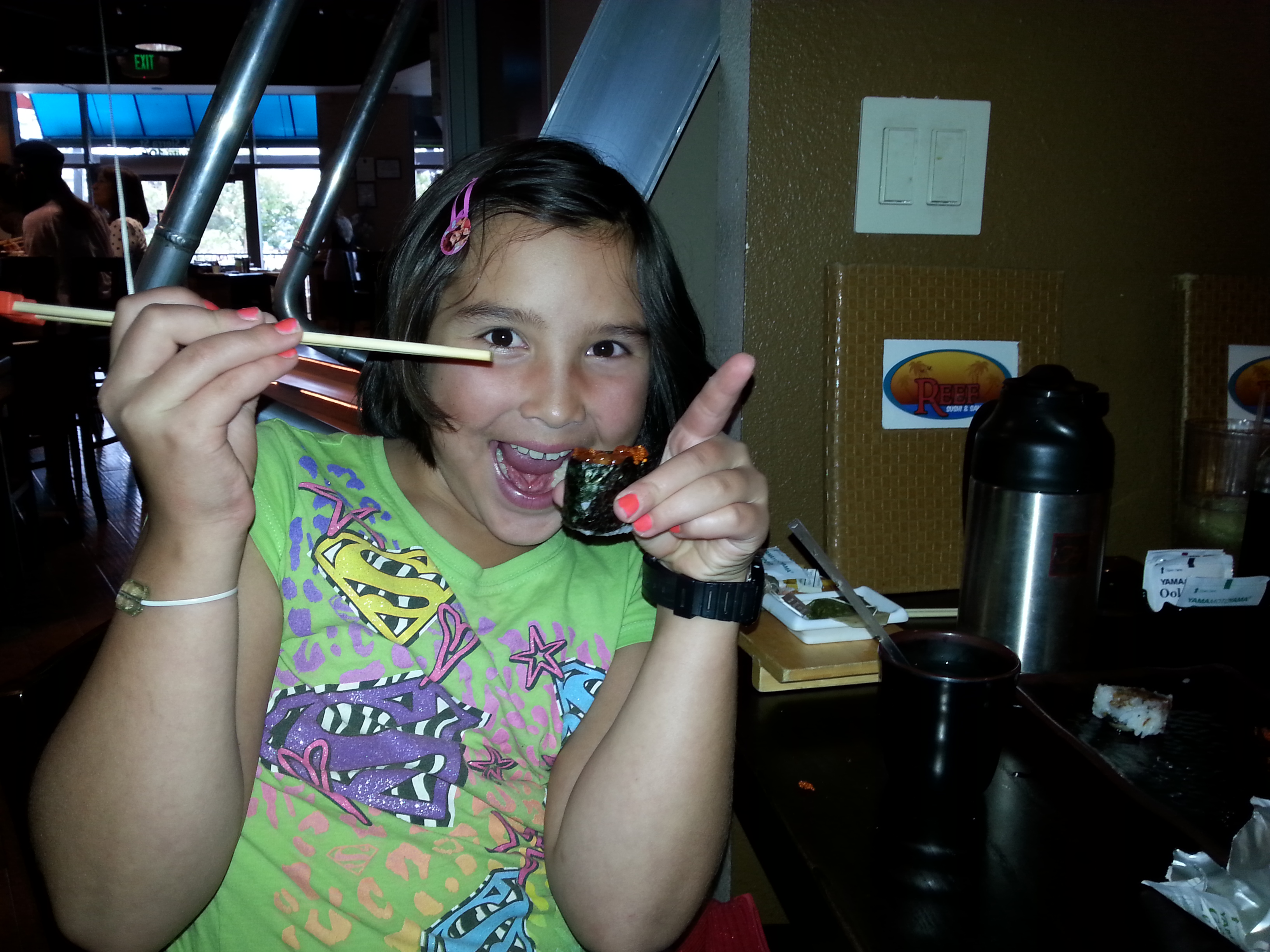 Lover of sushi (especially salmon eggs – ewww, how can she stand to eat fish bait??)