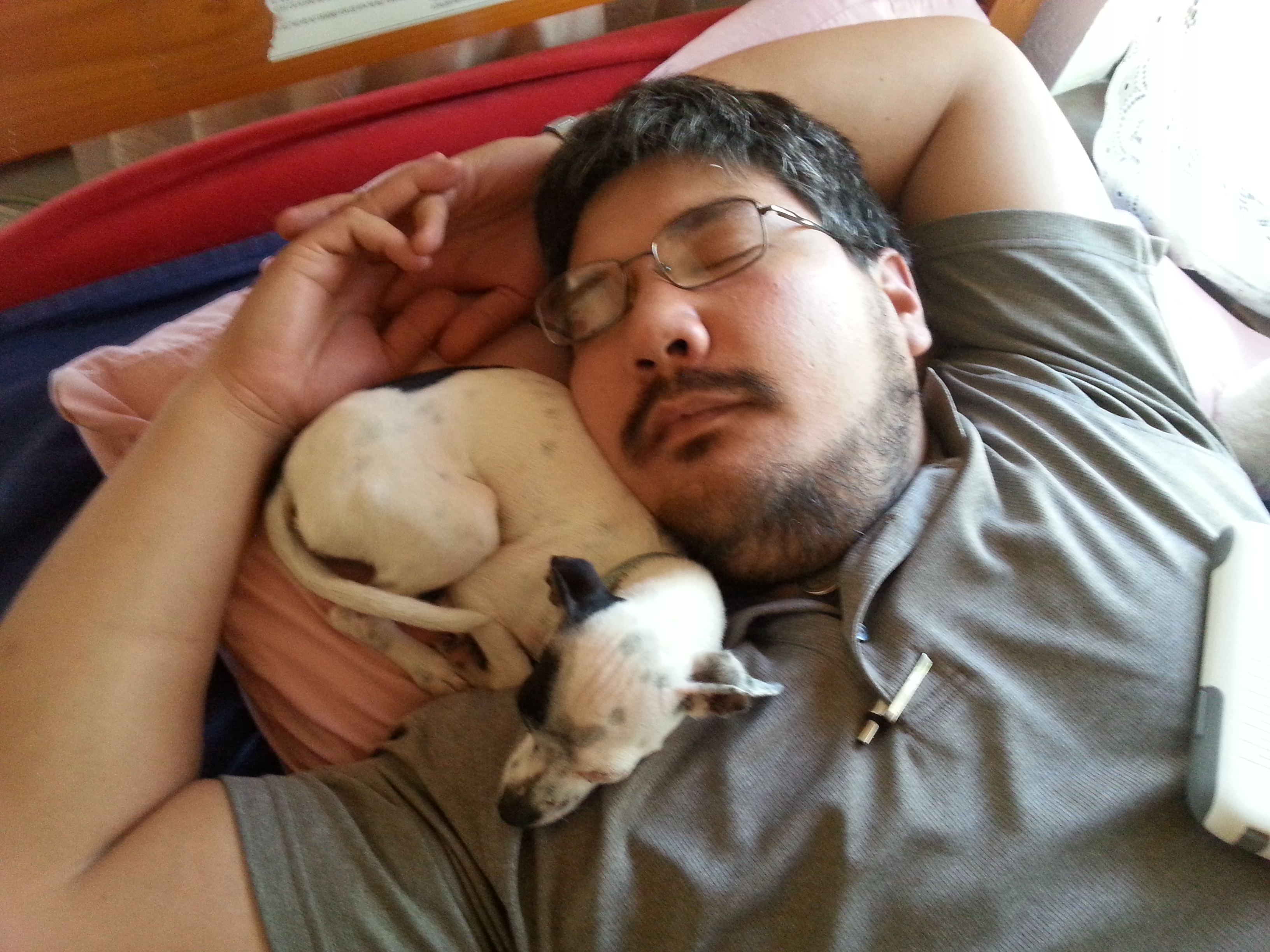 Love this one. The hubs passed out for a nap and Scooter made herself at home. She is definitely a cuddler!