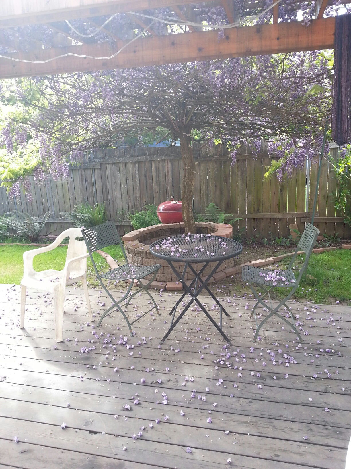 The three hens who were not busy laying quickly headed for the compost heap on the other side of the yard. I put some feed out for them in their run and made sure they had water, but I had forgotten to bring out the kitchen scraps. I brought those out and emptied them in the big tray in their run and then went to stand on the back deck admiring the wisteria.