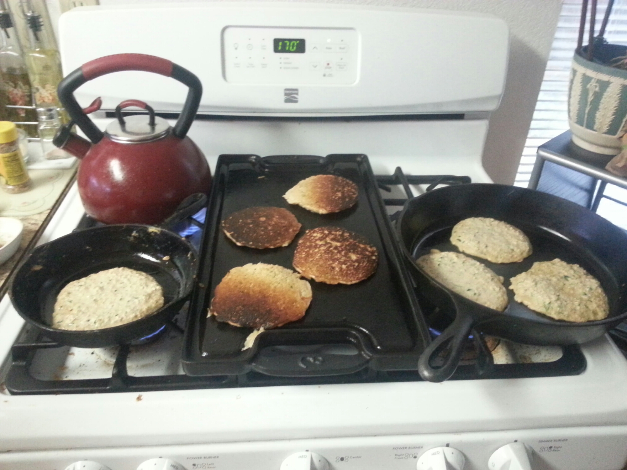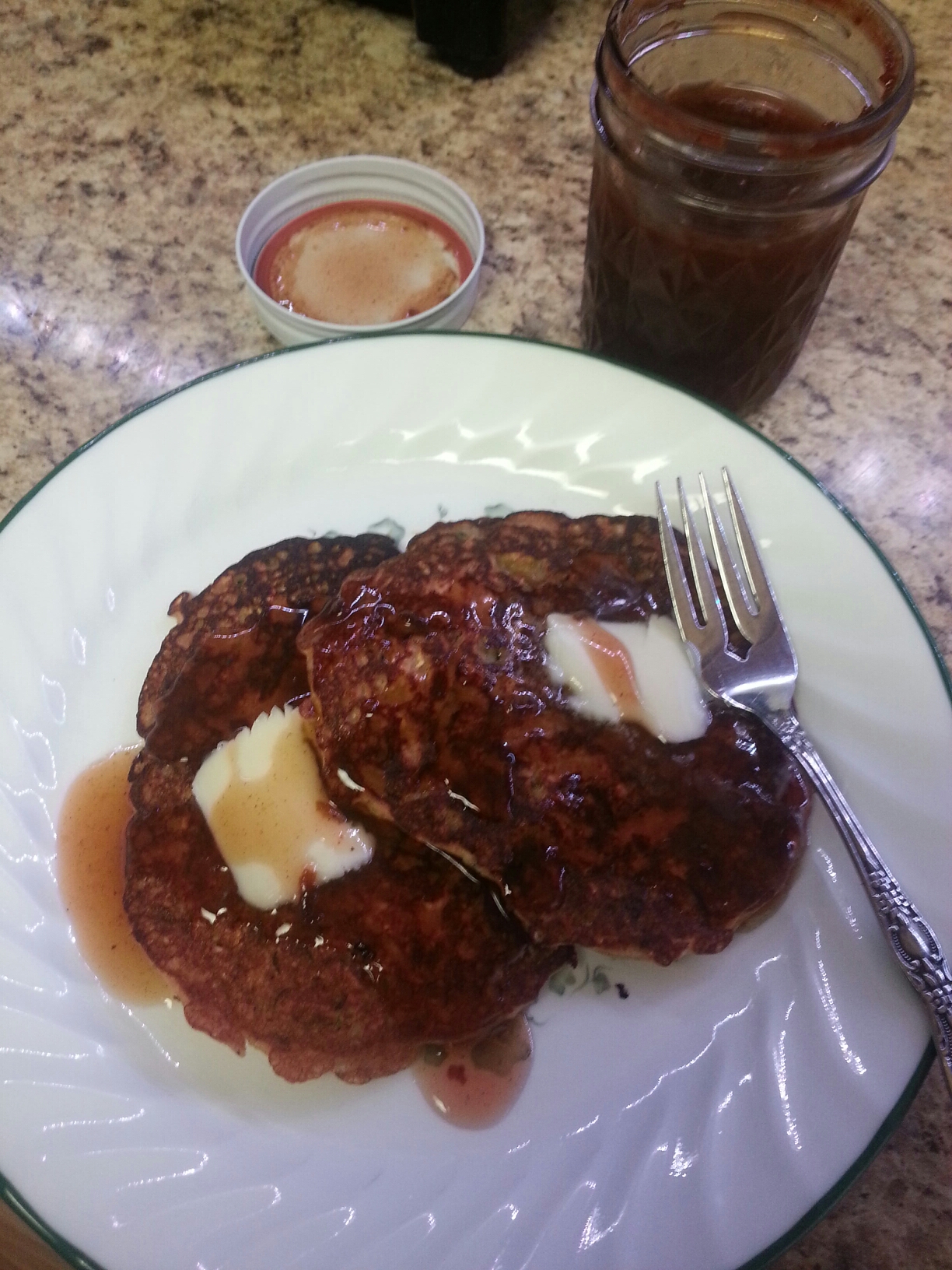 I stumbled across this oat pancake recipe at www.mountainmamacooks.com. Orginally it called for a banana, but I am fresh out of bananas and I have quite a lot of frozen zucchini from this summer’s bounty. Besides, the Hubby likes zucchini better than banana anyway. (BTW, I think it’s so adorable that Flower Girl says banana like a Minion – BAN-nah-nah :-). The original recipe also called for almond milk, but we use regular milk.