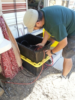 Anyway, when we get ready to wash, we make sure the barrel has enough water, hook up the pump to the battery, turn on the genny, plug in the washer, and then use as normal.