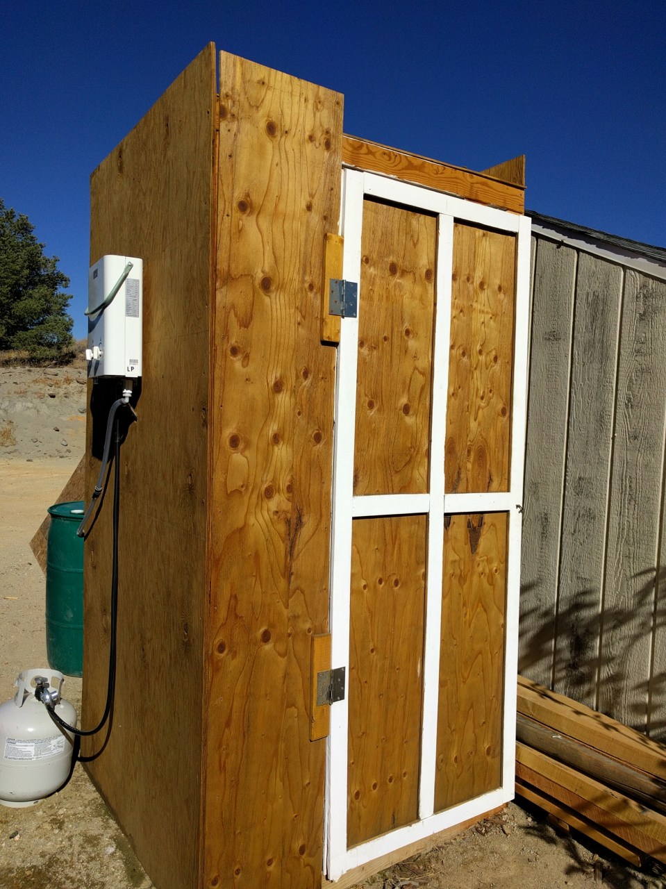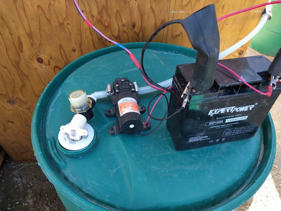 This 4×4 mini-shed makes a very spacious and wonderful shower. We use a 20 amp hour, 12 volt battery connected to an RV water pump which sits on top of one of our 50 gallon barrels of water.