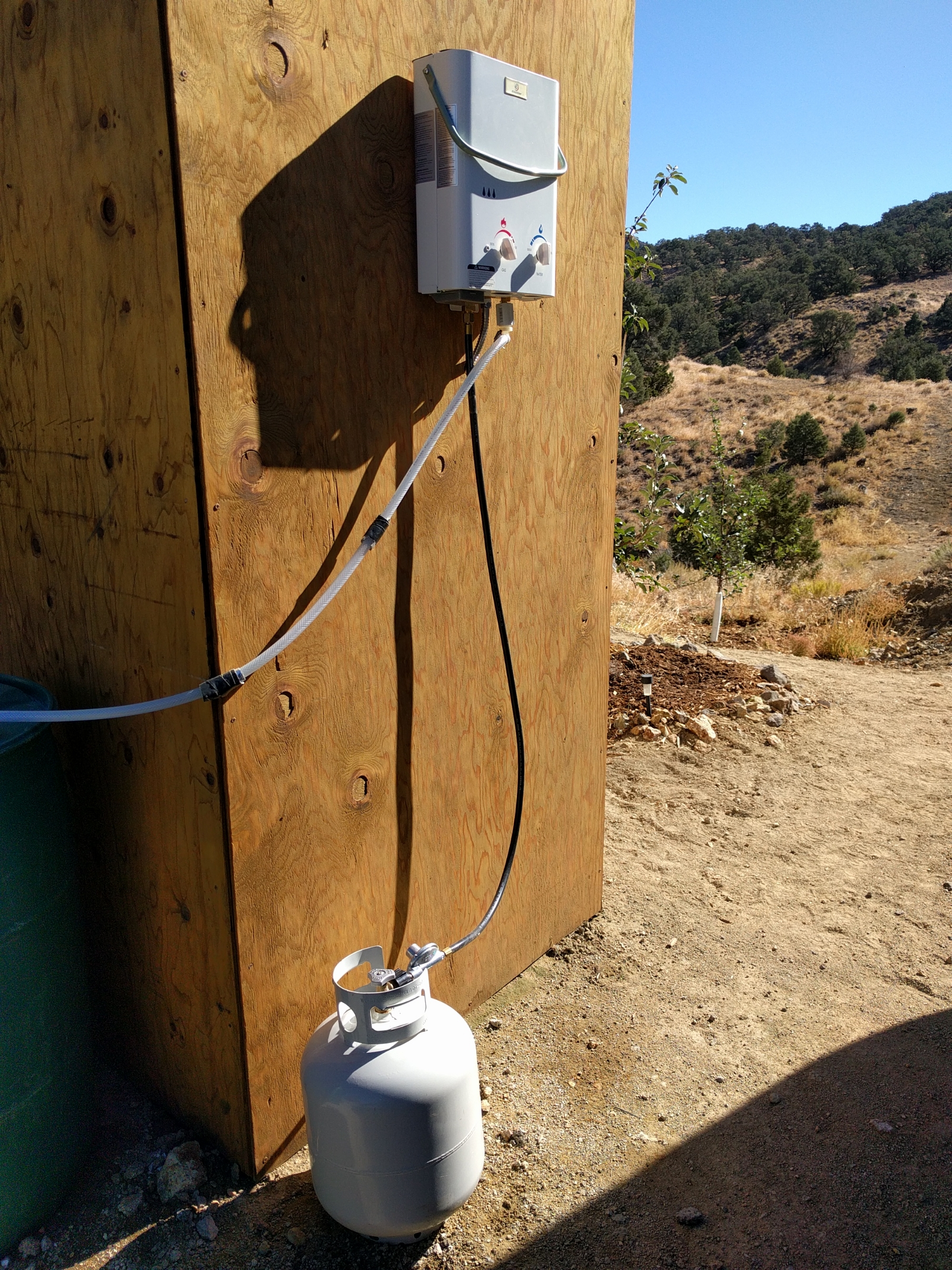 Right now, we only have the ability to turn the water on and off while inside the shower, not adjust the temperature. So showering can be quite the adventure depending on how warm the ambient air is as well as how warm the water inside the barrel has gotten. If you’re taking a shower mid-afternoon on a warm day, you’d better turn that puppy waaaay down before you get in there. 😀 We have plans to rig it up so we can adjust the temperature from inside. But we’ve had a few, more pressing projects.