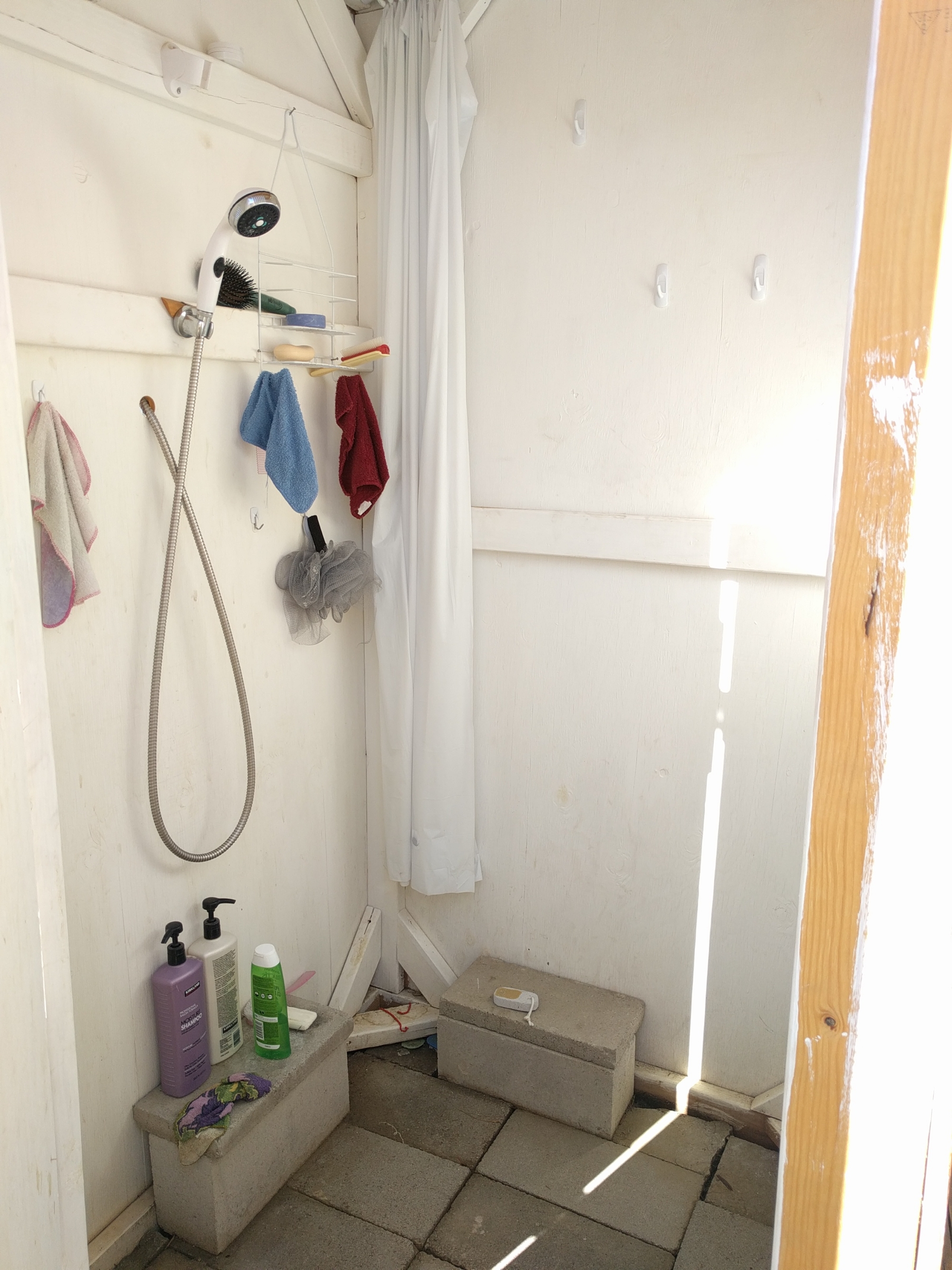 There is no floor built into the shower. Rather, we placed pavers on the ground inside so the water can drain easily.