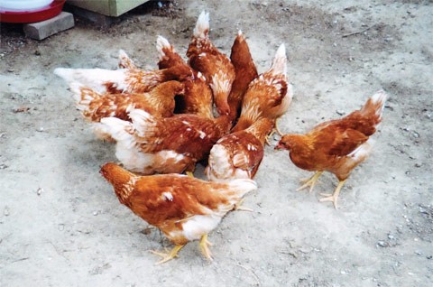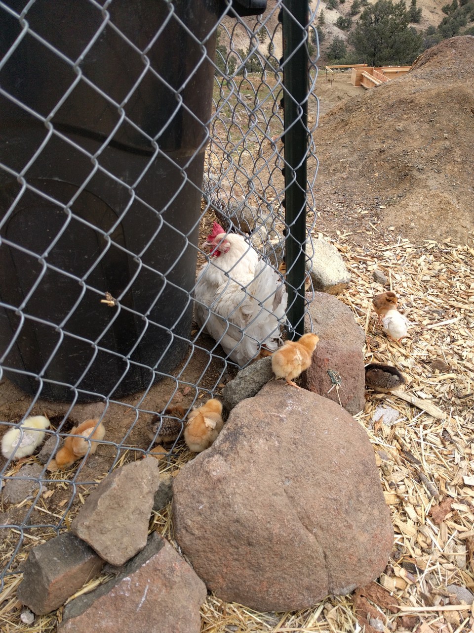 Mamma in the chicken run, babies small enough to free range through the fence. (But they never get too far from mamma!)