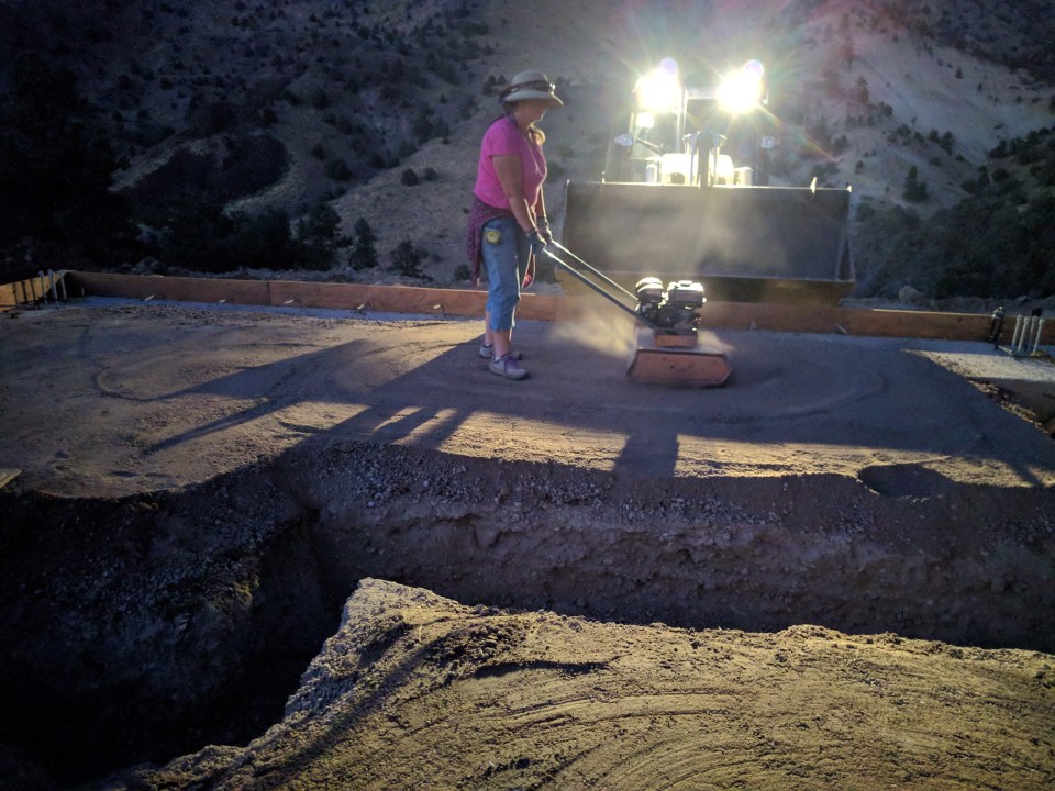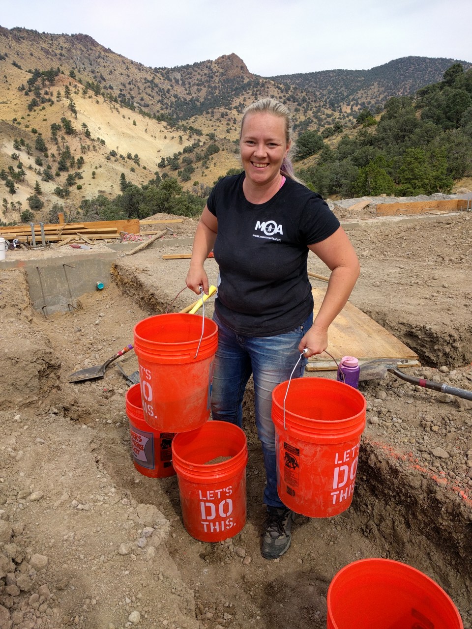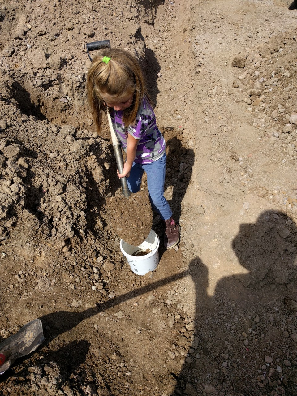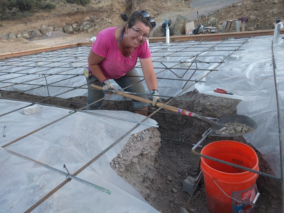 My sis-in-law lugging some buckets of dirt out of the forms.