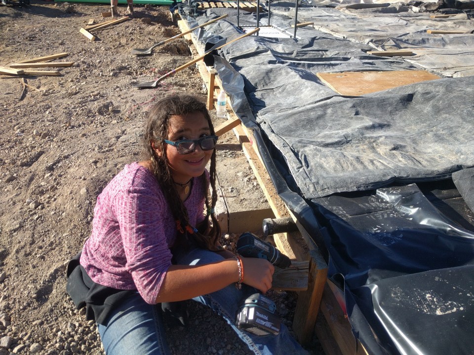 My sis-in-law lugging some buckets of dirt out of the forms.