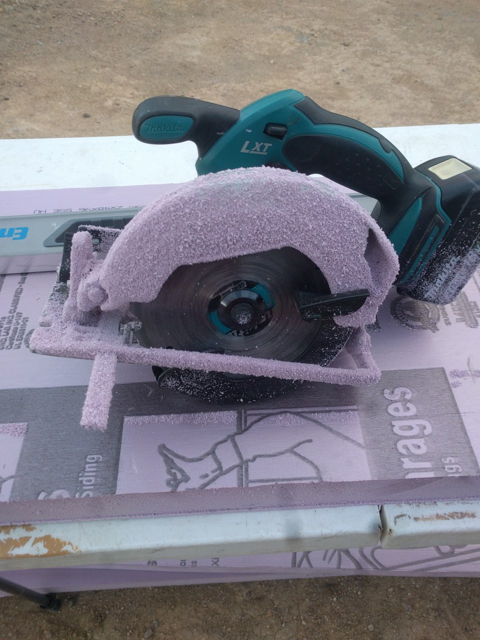 Oh, well, at least it is super easy to cut. I actually set the depth of the saw to not go all the way through the foam. That way, I could set the sheet of foam on the slab, make my cut line, then snap the last little bit. This was really good since the winds were blowing about 30mph that day. You can imagine what happens to lightweight foam in 30mph winds! Any time we set a piece down, it had to have something heavy on it to keep it from blowing clear away.