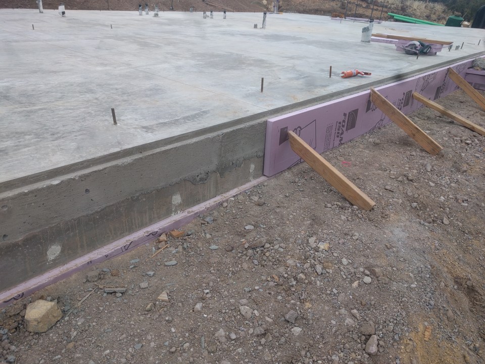 Once we got the pad cleaned up, we needed to prep the slab itself to bring in more fill dirt to raise the ground level to slab height. In order to do that, we needed to finish wrapping the footers and slab edge in foam insulation. We had done the bottom 16 inches and then backfilled that months ago. So we had the final 16″ to do. Convenient since the 4’x8′ sheets of insulation have snap lines at 16″ sections (thus giving 3 sections that are 16″ x 8′ per sheet). Except that I forgot that each piece needed to be 14.5 inches because of a recessed lip on the edge of the concrete. which means we needed to cut the foam sheets rather than snap them on the pre-scored lines.