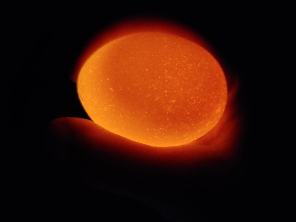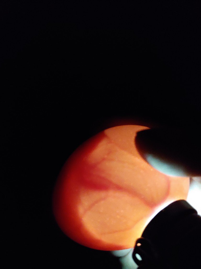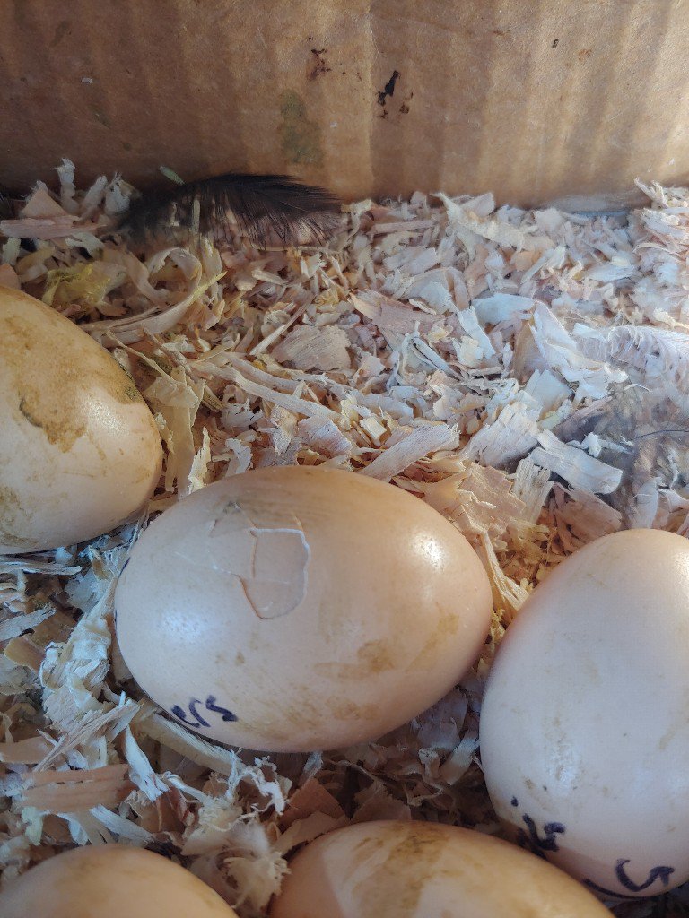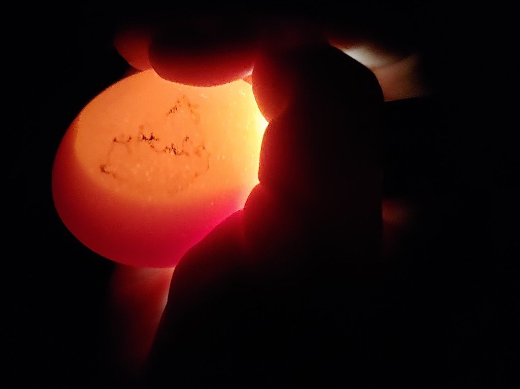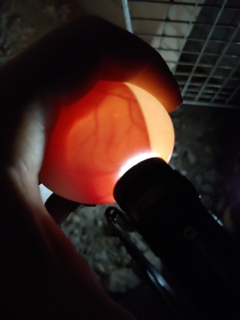 One egg had not developed, and one was missing (probably got broken). One of the remaining eggs will most likely not develop much further as the air sack is not in the correct position. Unlike in the picture above, the air sack is on the side, not at the end like it’s supposed to be. So, at most, we’ll get 9 chicks from that clutch, IF they all hatch. Considering last summer’s abysmal failures, I’m not counting my chicks until they hatch.
