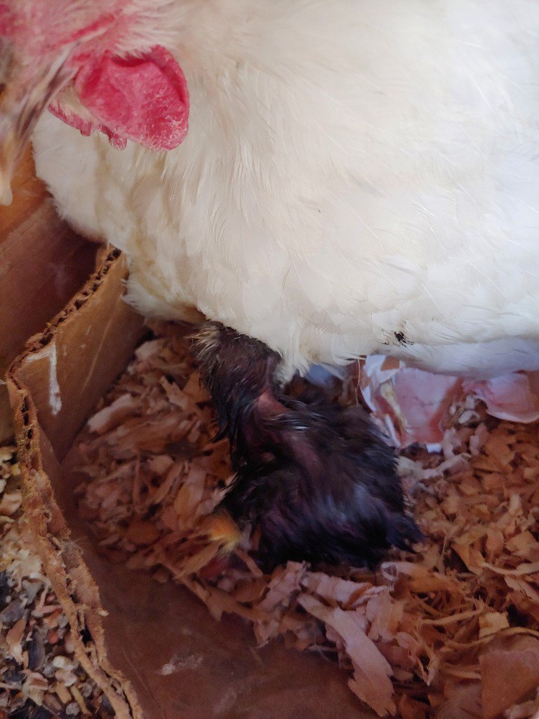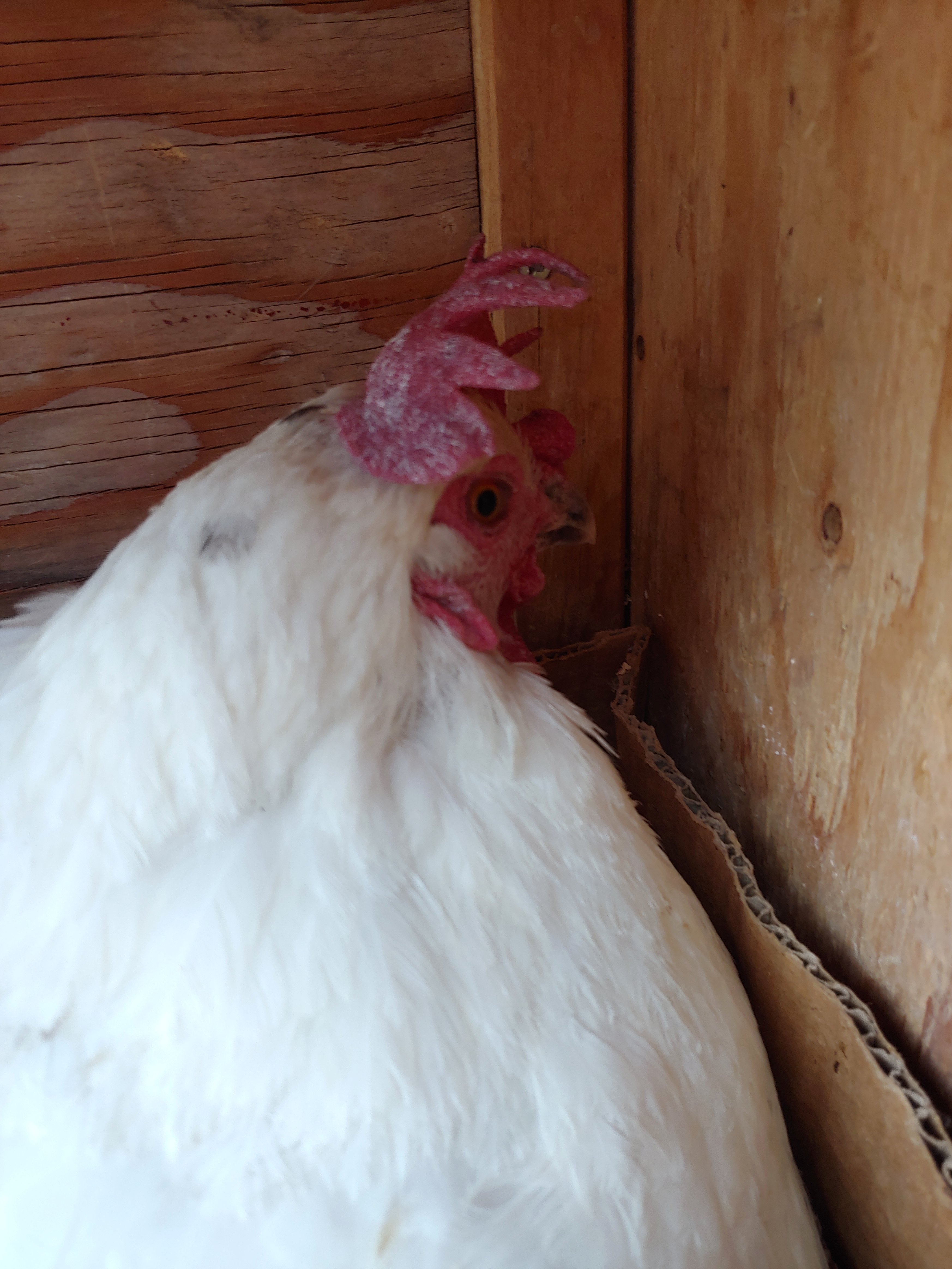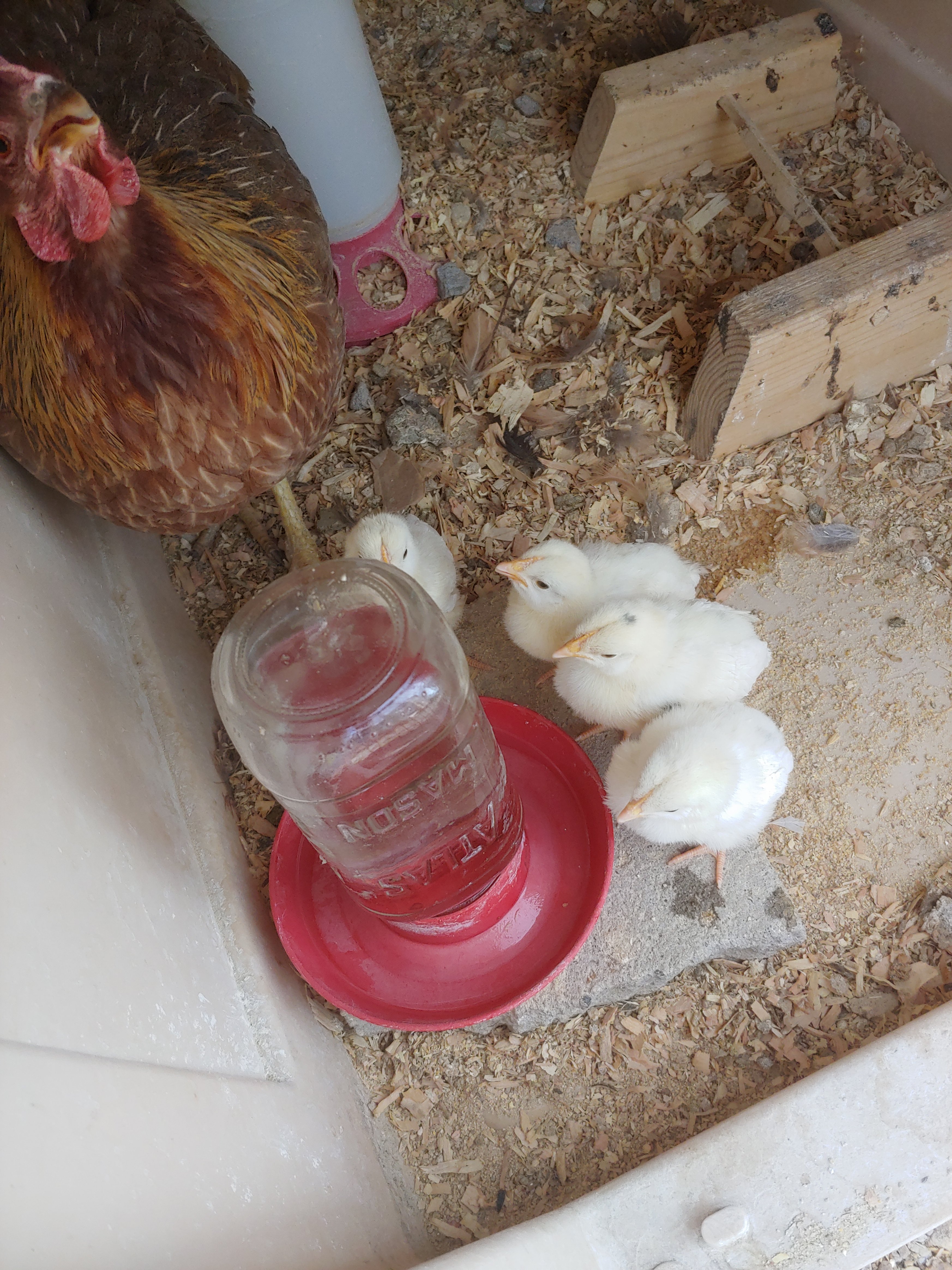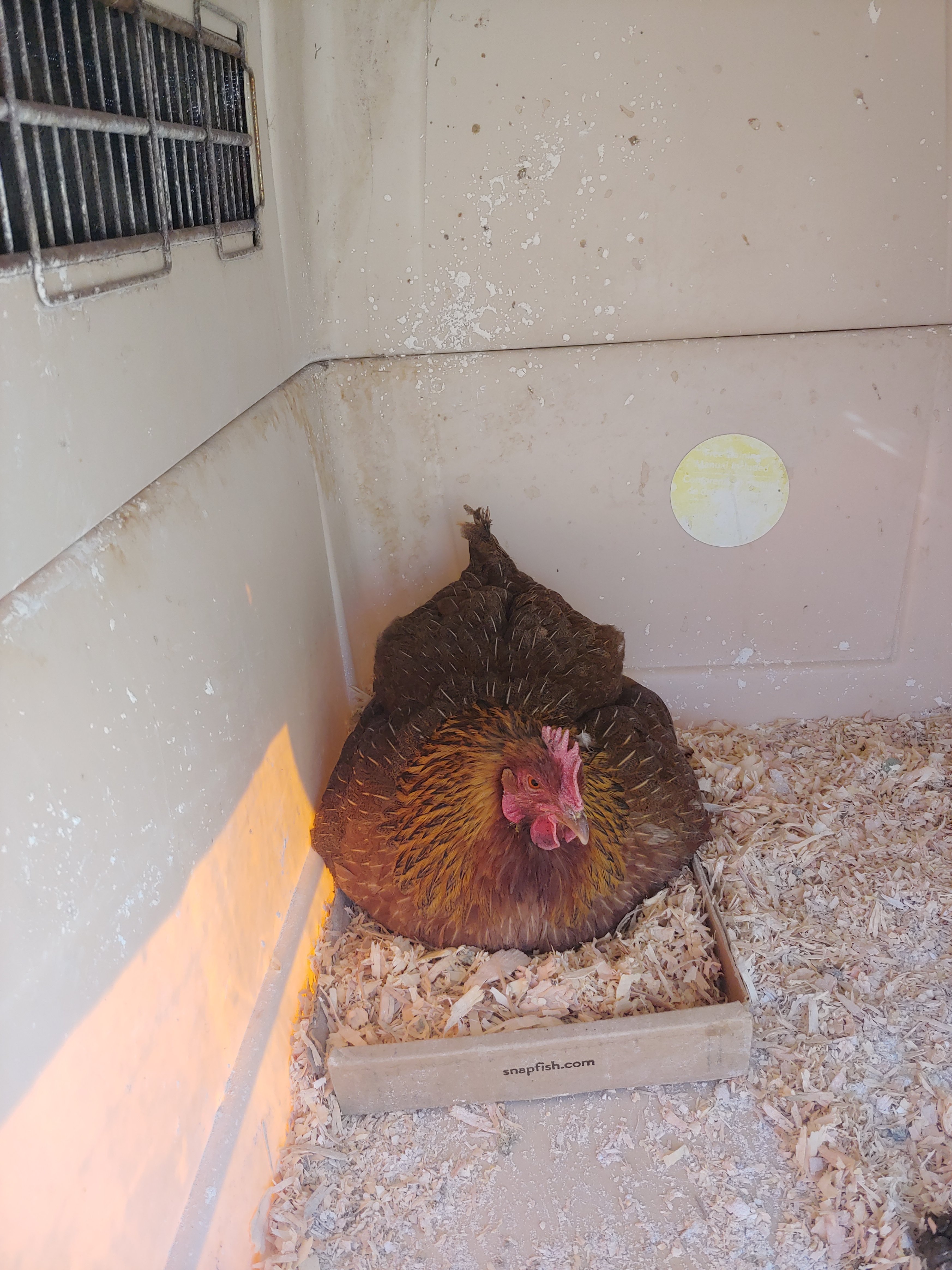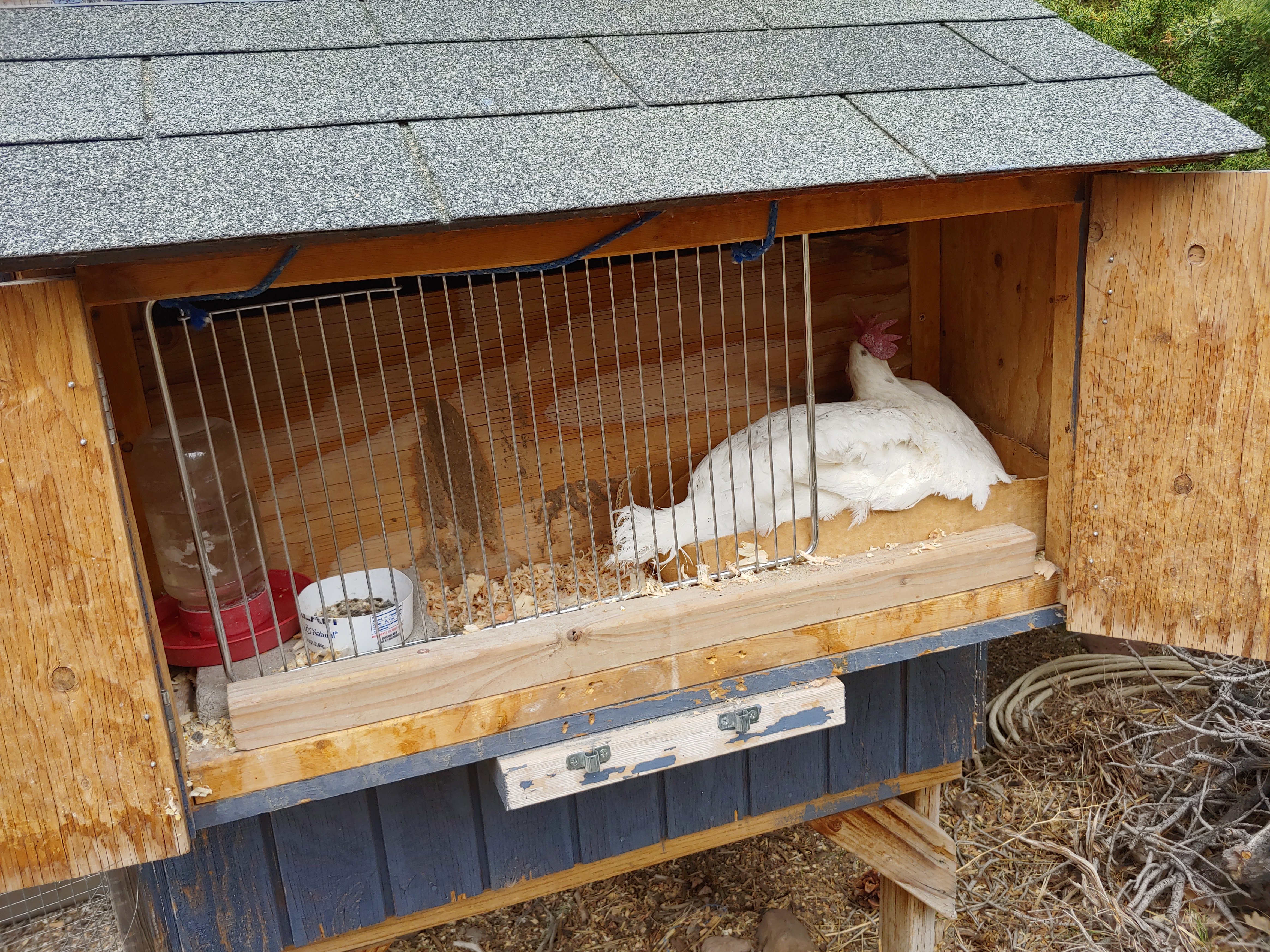 We have her set up in a large dog crate and think we have taken care of the mouse problem we had last time we had a hen be broody in this box (by getting cats and by not leaving food in the crate over night).