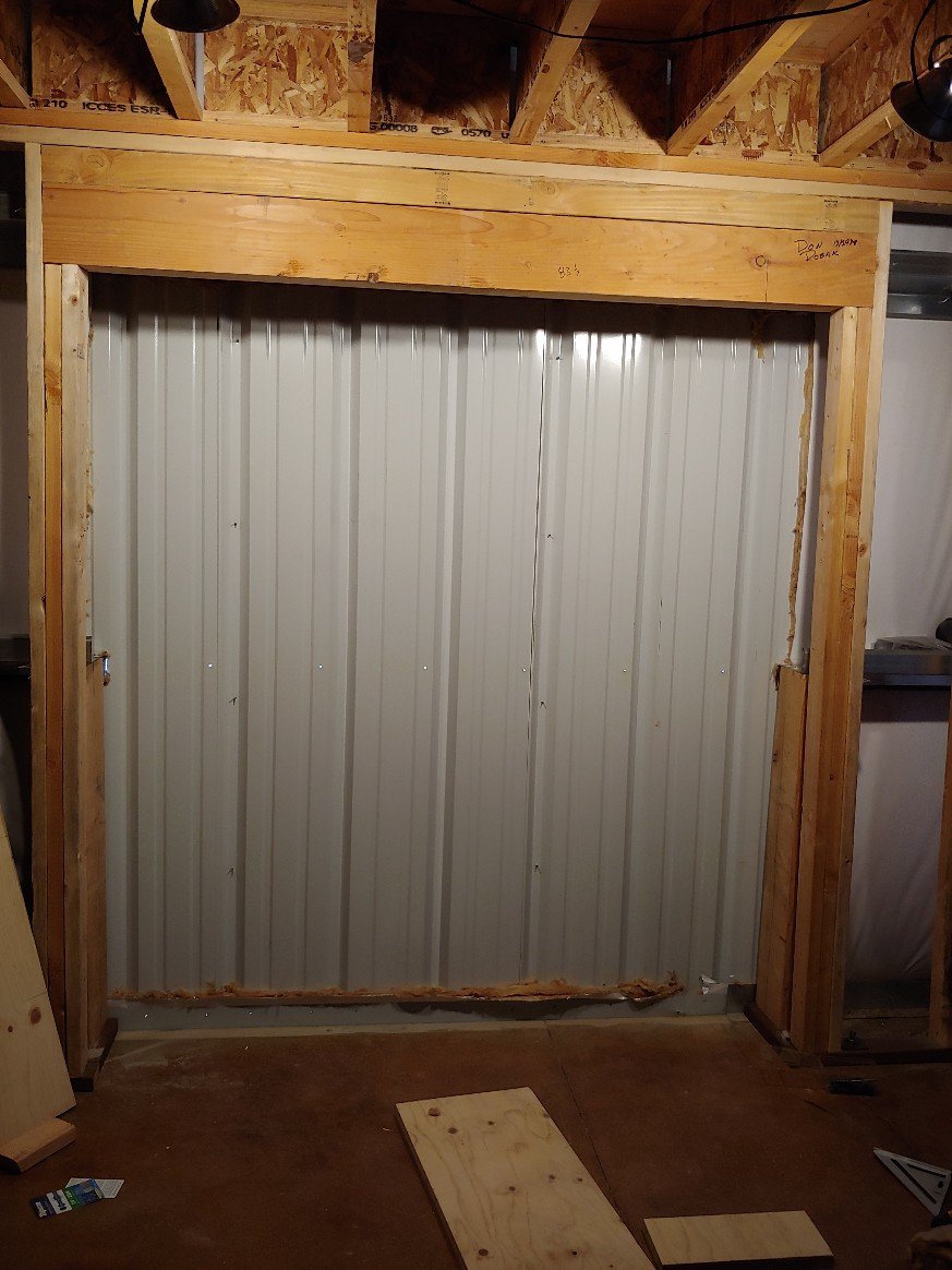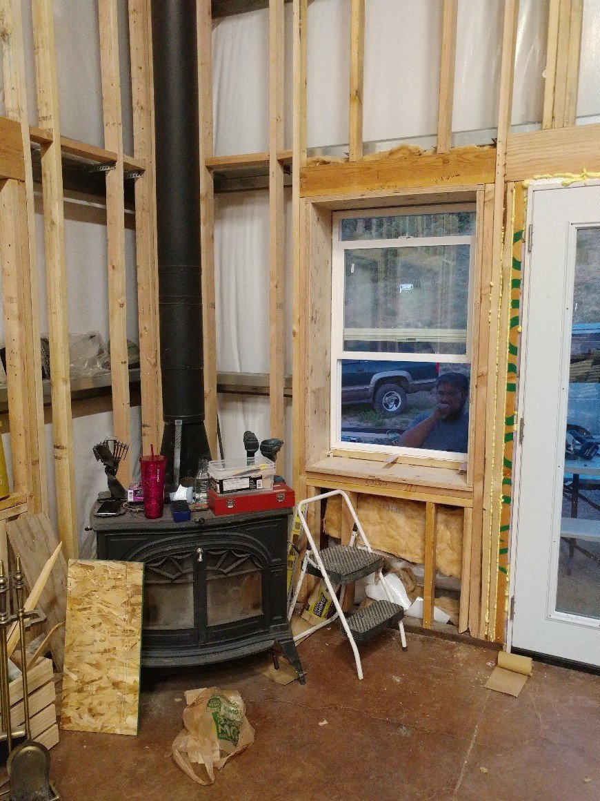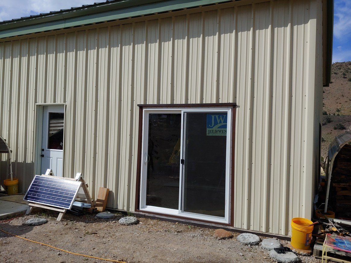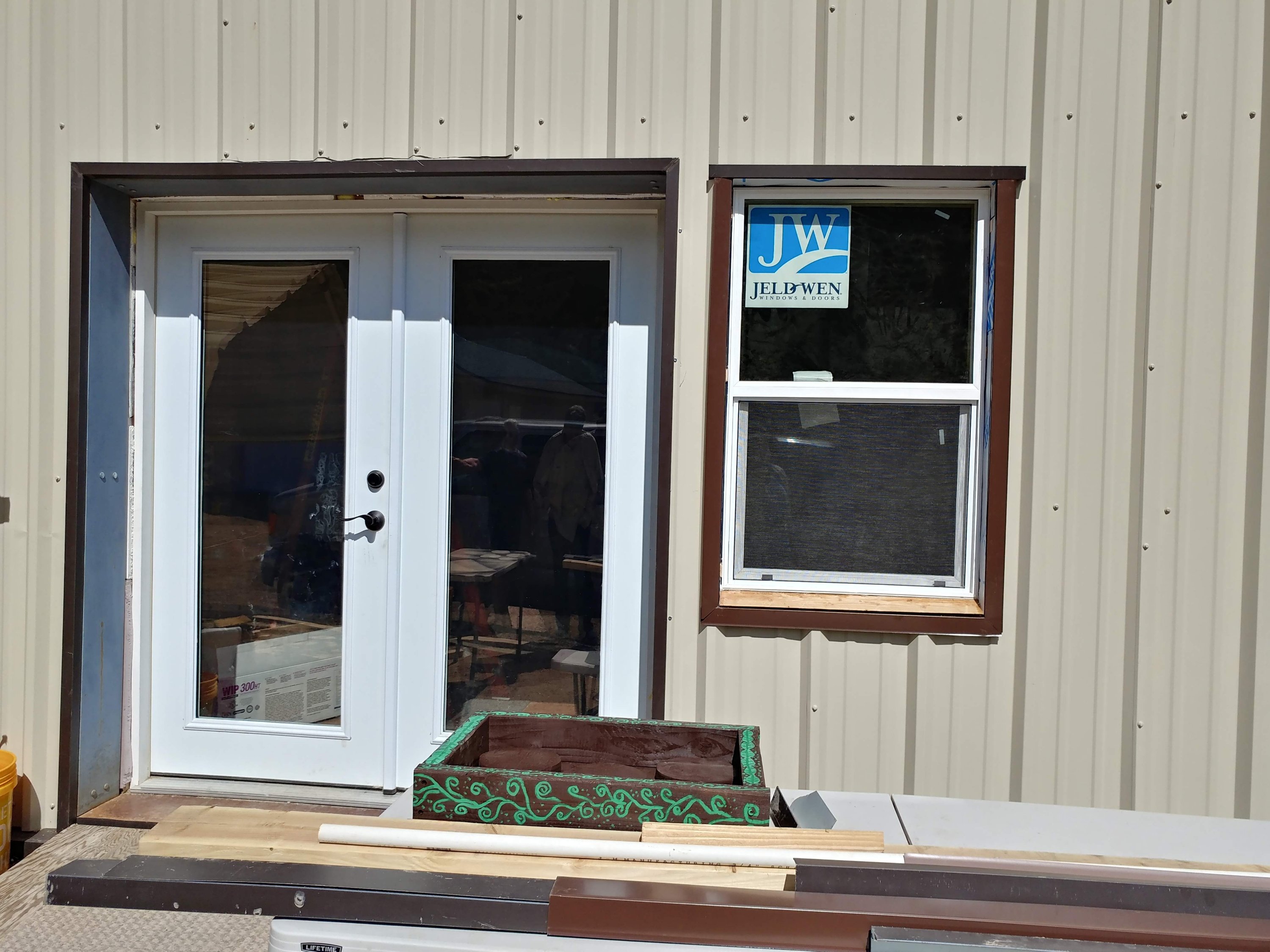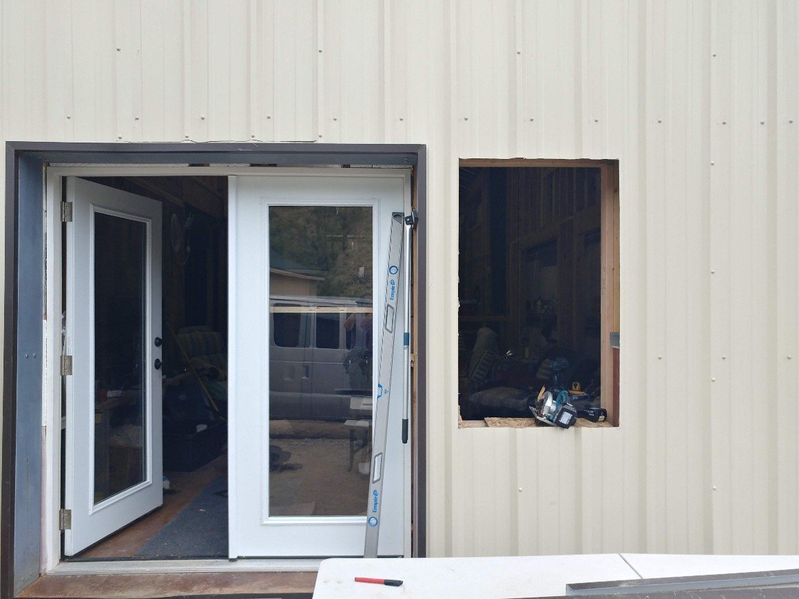 Same wall as the previous pic – Interior – before door and window openings are cutWe chose to not have the metal building designed with all the window and door openings because we knew we’d be building these interior walls during the winter time. Because of how we needed to attach the interior walls to the exterior walls at the openings, we could not put the windows in until the interior walls were built.Which means, if we had already had the openings in the metal building, we would not have been able to heat the house and keep working in it over the winter (which was when we were building those walls). We would have lost all that working time.And would have been even further behind than we are now.But we finally got all the interior framing done, so it was time to tackle the windows and doors!We are planning on making a blog post and even a video about the actual technical method to put in the windows and doors, but for now, here’s the less detailed and less tedious (I hope) version.The first window we put in was next to the front door.