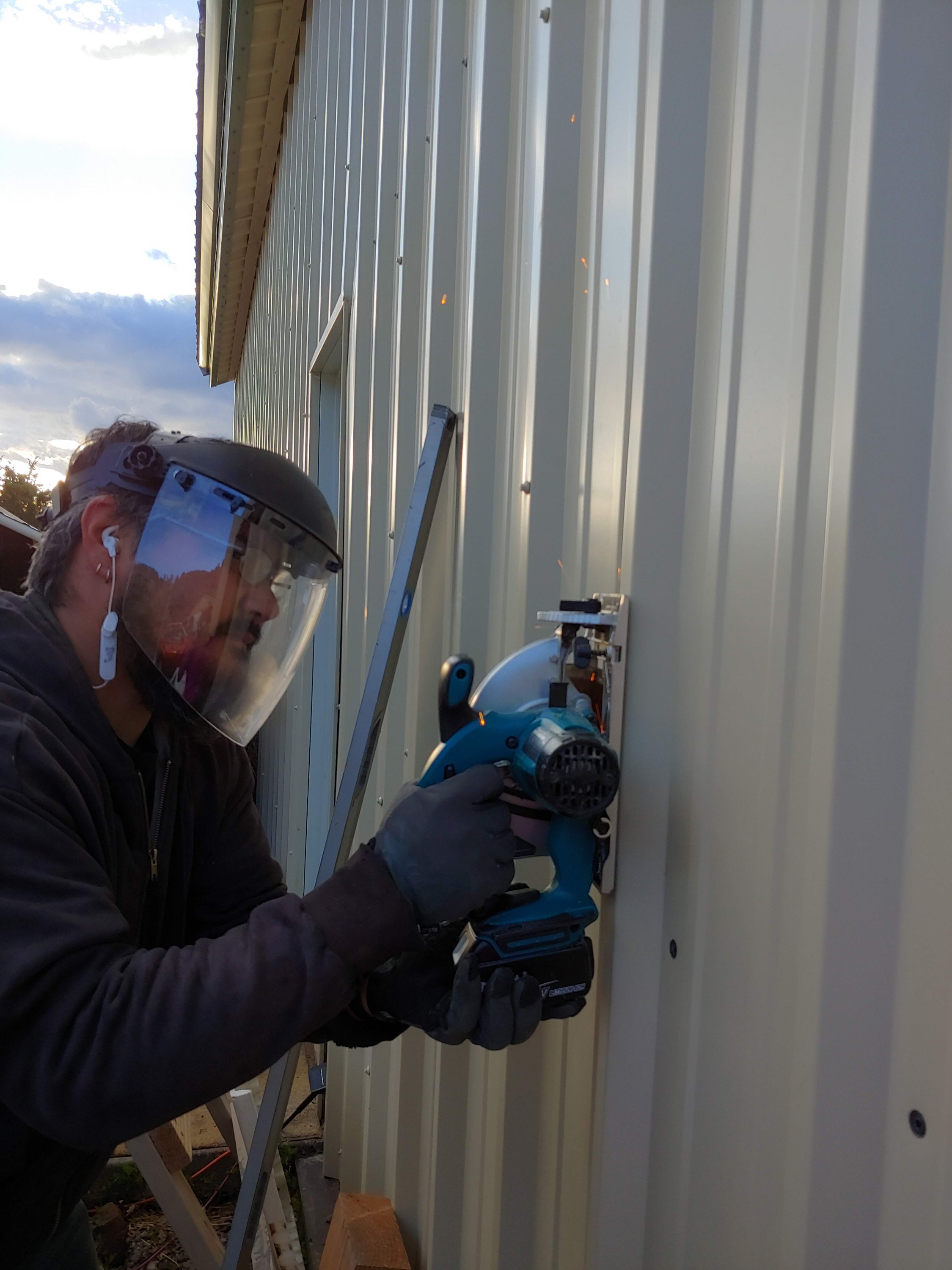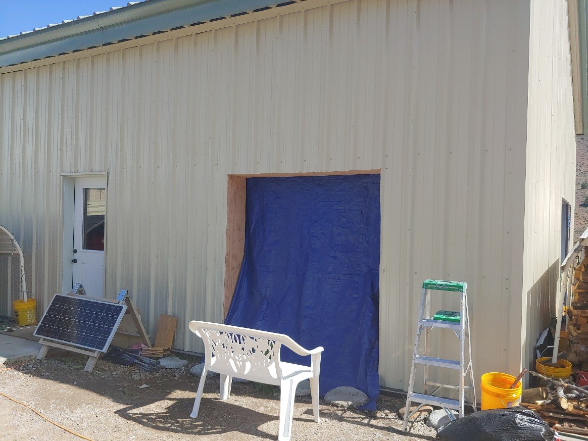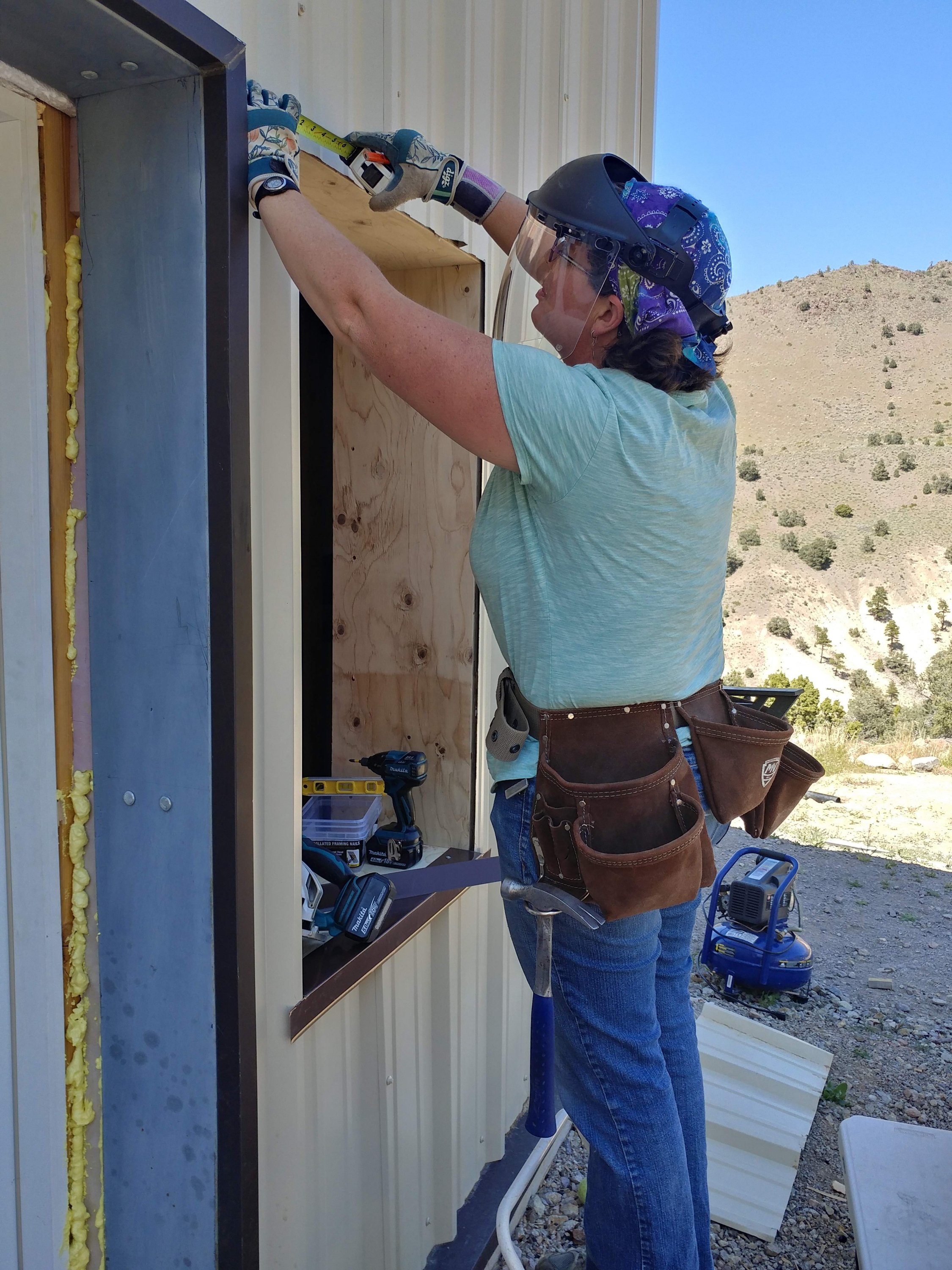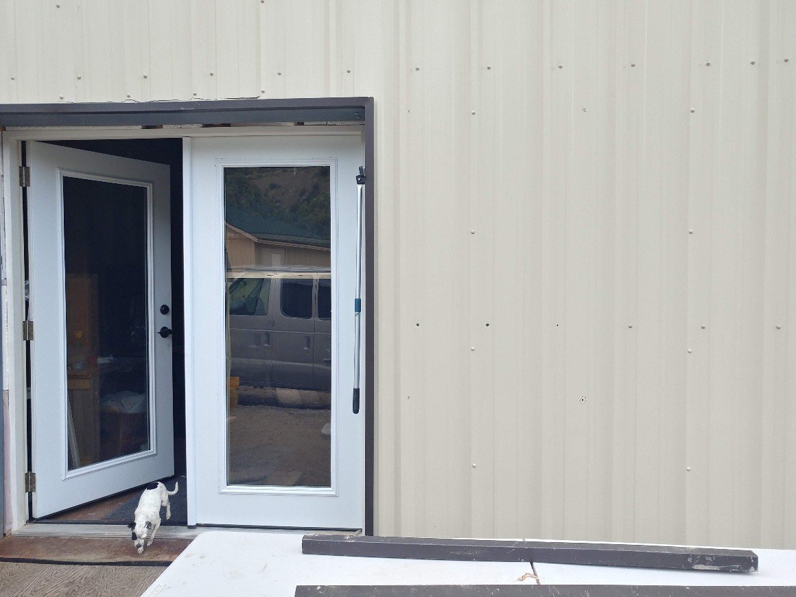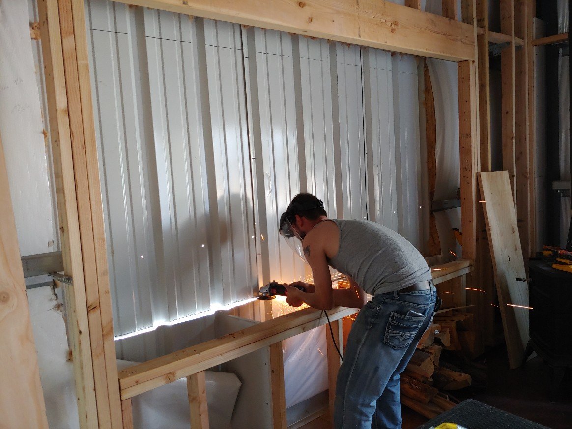Same wall as the previous pic – Interior – before door and window openings are cutWe chose to not have the metal building designed with all the window and door openings because we knew we’d be building these interior walls during the winter time. Because of how we needed to attach the interior walls to the exterior walls at the openings, we could not put the windows in until the interior walls were built.Which means, if we had already had the openings in the metal building, we would not have been able to heat the house and keep working in it over the winter (which was when we were building those walls). We would have lost all that working time.And would have been even further behind than we are now.But we finally got all the interior framing done, so it was time to tackle the windows and doors!We are planning on making a blog post and even a video about the actual technical method to put in the windows and doors, but for now, here’s the less detailed and less tedious (I hope) version.The first window we put in was next to the front door.
