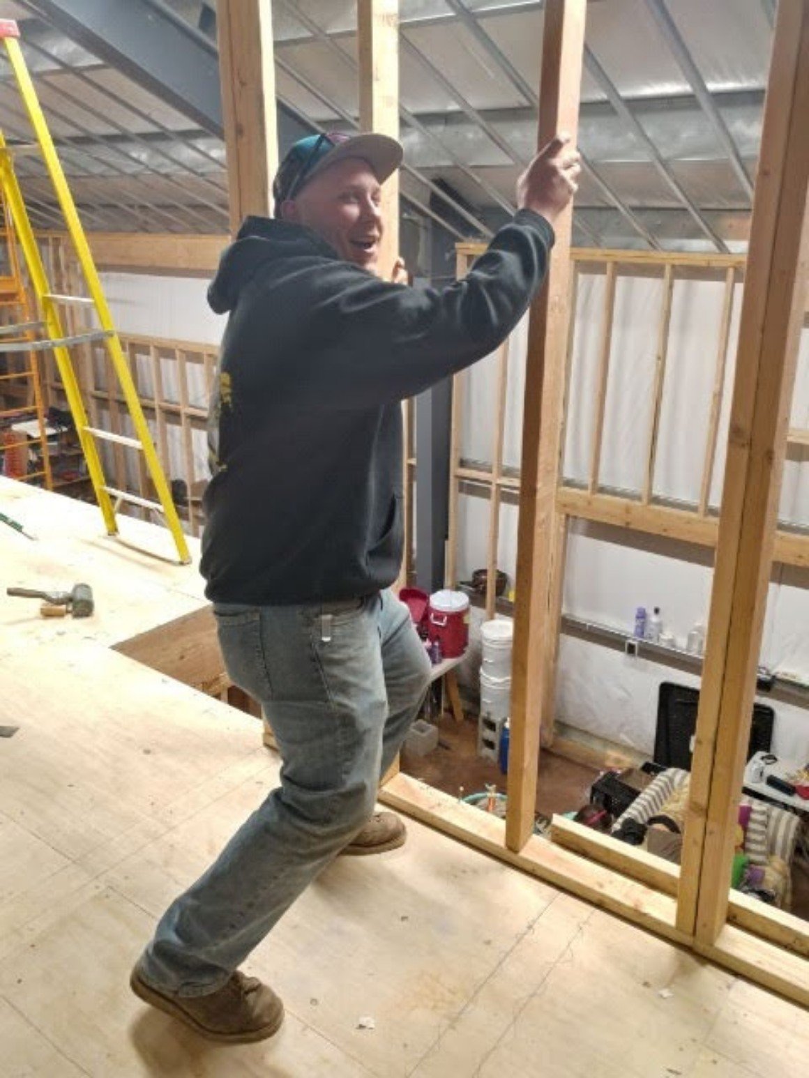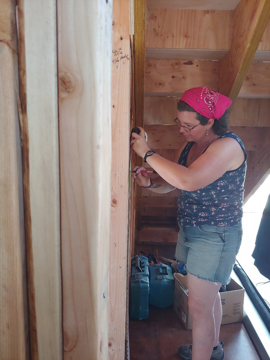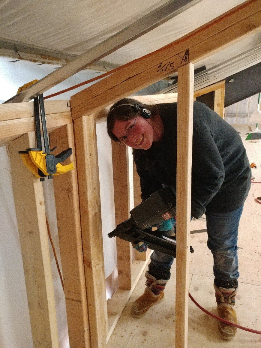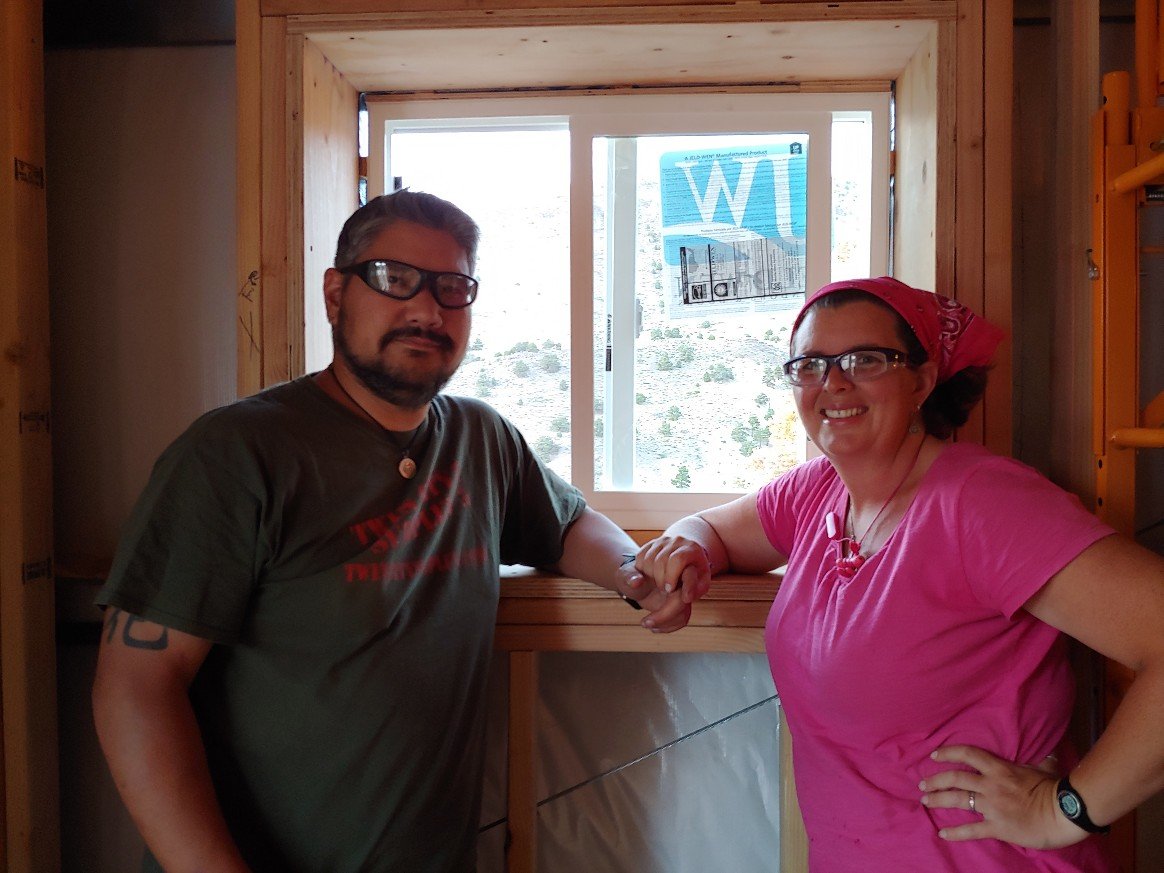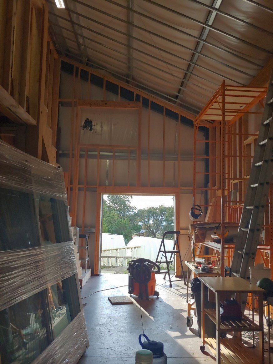 Same wall as the previous pic – Interior – before door and window openings are cutWe chose to not have the metal building designed with all the window and door openings because we knew we’d be building these interior walls during the winter time. Because of how we needed to attach the interior walls to the exterior walls at the openings, we could not put the windows in until the interior walls were built.Which means, if we had already had the openings in the metal building, we would not have been able to heat the house and keep working in it over the winter (which was when we were building those walls). We would have lost all that working time.And would have been even further behind than we are now.But we finally got all the interior framing done, so it was time to tackle the windows and doors!We are planning on making a blog post and even a video about the actual technical method to put in the windows and doors, but for now, here’s the less detailed and less tedious (I hope) version.The first window we put in was next to the front door.