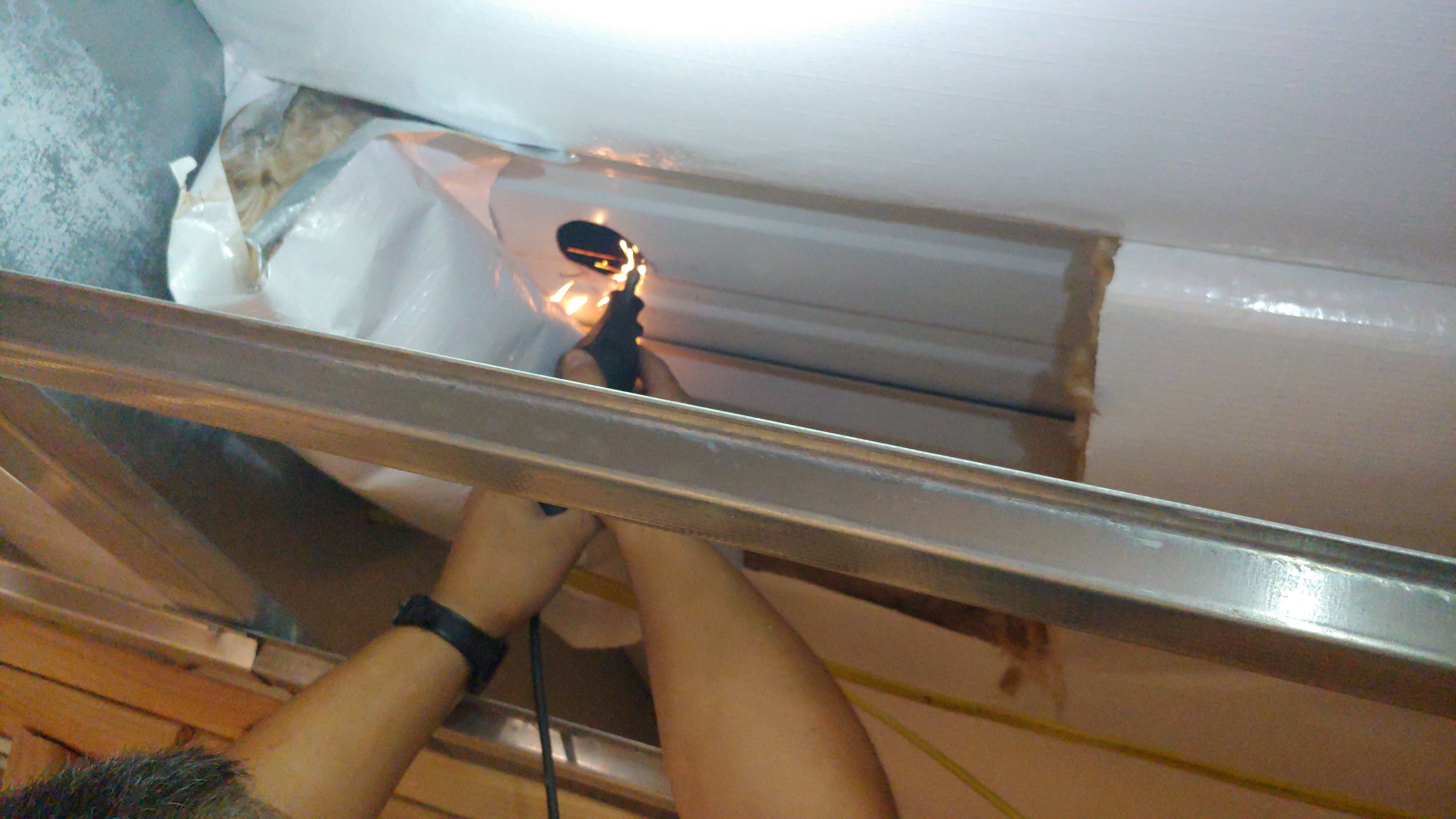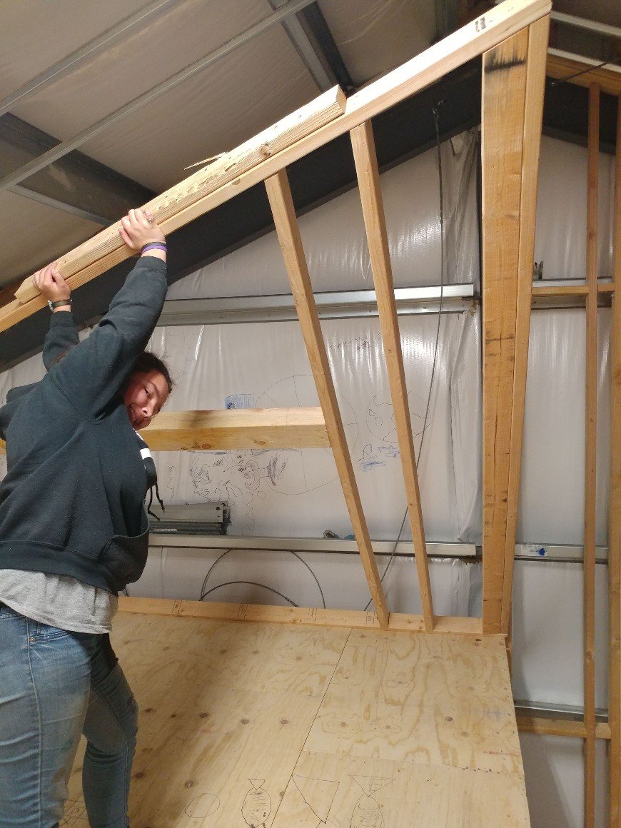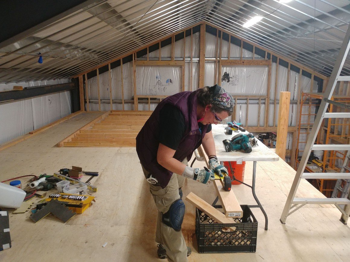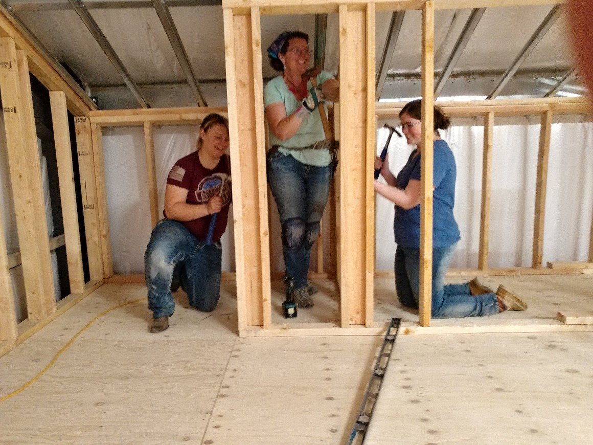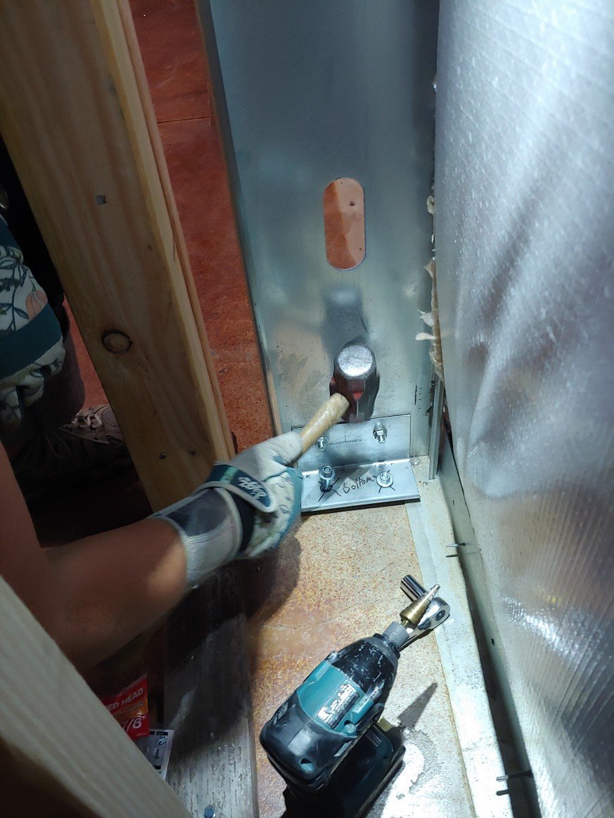 Same wall as the previous pic – Interior – before door and window openings are cutWe chose to not have the metal building designed with all the window and door openings because we knew we’d be building these interior walls during the winter time. Because of how we needed to attach the interior walls to the exterior walls at the openings, we could not put the windows in until the interior walls were built.Which means, if we had already had the openings in the metal building, we would not have been able to heat the house and keep working in it over the winter (which was when we were building those walls). We would have lost all that working time.And would have been even further behind than we are now.But we finally got all the interior framing done, so it was time to tackle the windows and doors!We are planning on making a blog post and even a video about the actual technical method to put in the windows and doors, but for now, here’s the less detailed and less tedious (I hope) version.The first window we put in was next to the front door.