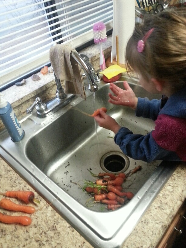 My three year old washing the last of the carrots from the garden. I was able to start her on the task and walk away to finish other tasks. Yes, she took forever, but she did the job and did it well. When did she get so big??