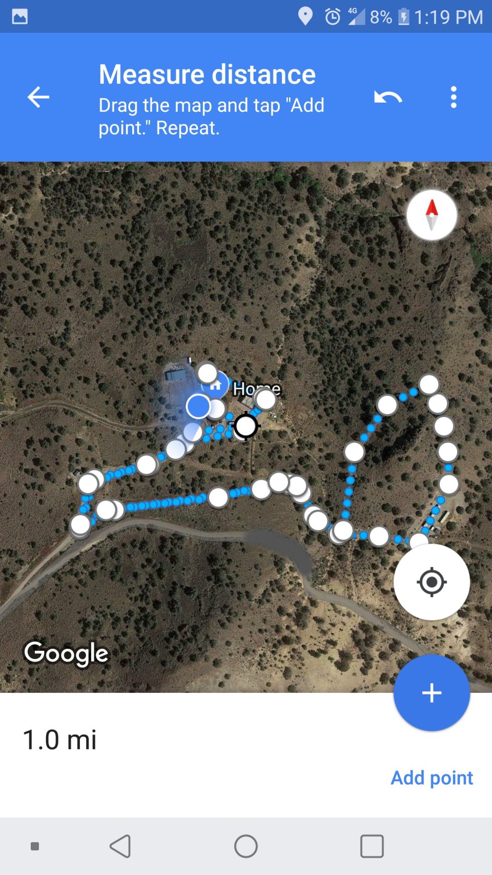 So, I have mapped out a one mile route from our trailer, around the house, up the upper driveway and around Castle Rock and back.