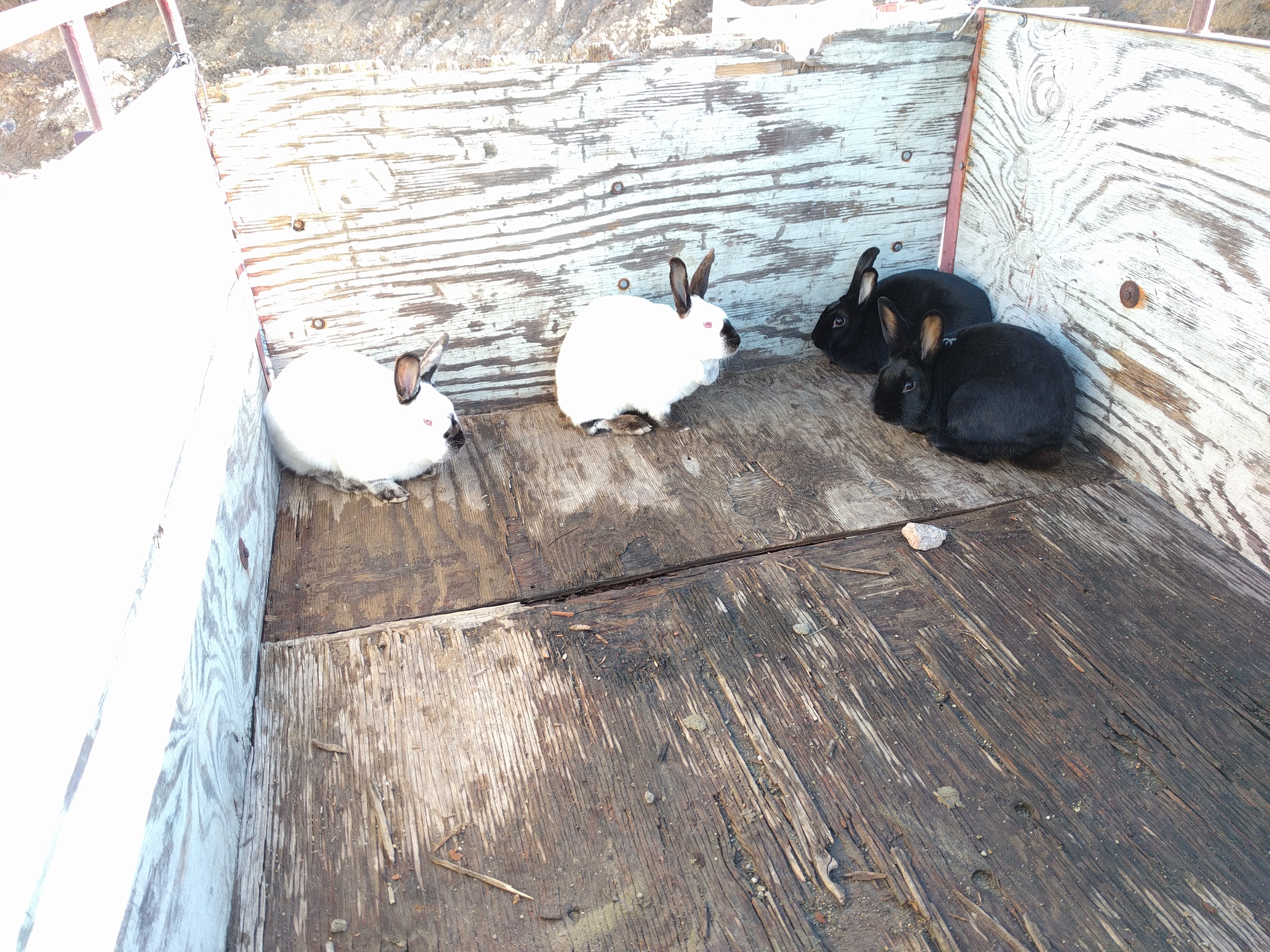 And the rabbits. Yes. That is three females and two males all running around in a box trailer together. Yes, that means babies in about a month. But the deed was done before we got home. They had all gotten out of their cages and were running around in the trailer with the chickens. Figured that since the deed was already done, it wouldn’t hurt for them to live in colony until we can get their hutch repaired. That’s our project for this weekend. And in just a month, we’re gonna have babies. Lots of cute, cuddly, fluffy baby bunnies. Just in time for Christmas.