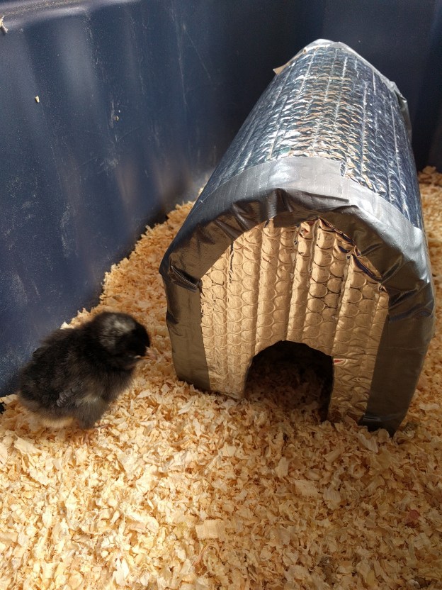 So, to keep our little chickies warm, we built a little hut out of some reflectix we had laying around. (Reflectix is a insulative mylar and bubble wrap material, basically what a lot of car windshield shades are made from.)